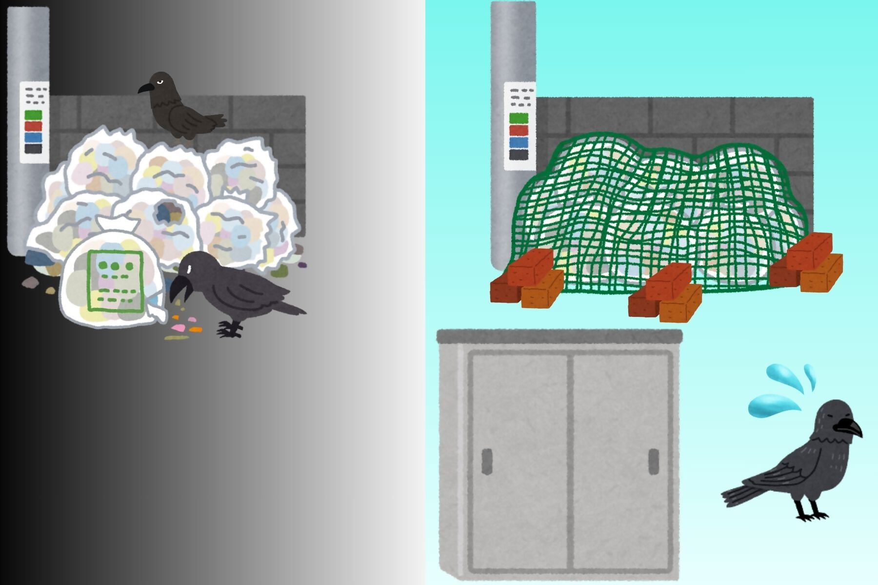 また、カラス対策としては、簡易的なネットや折り畳み式のネットボックス、金属製の集積庫などがあります。ただし、簡易的なネットや折り畳み式のネットボックスは、地面とのすきまからカラスに狙われる恐れがあります。簡易的ネットや折り畳み式のネットボックスを使用する際は、必ず地面とのすきまがないように平らな場所で使用し、レンガ等を活用し、地面とのすきまをなくすようにしてください