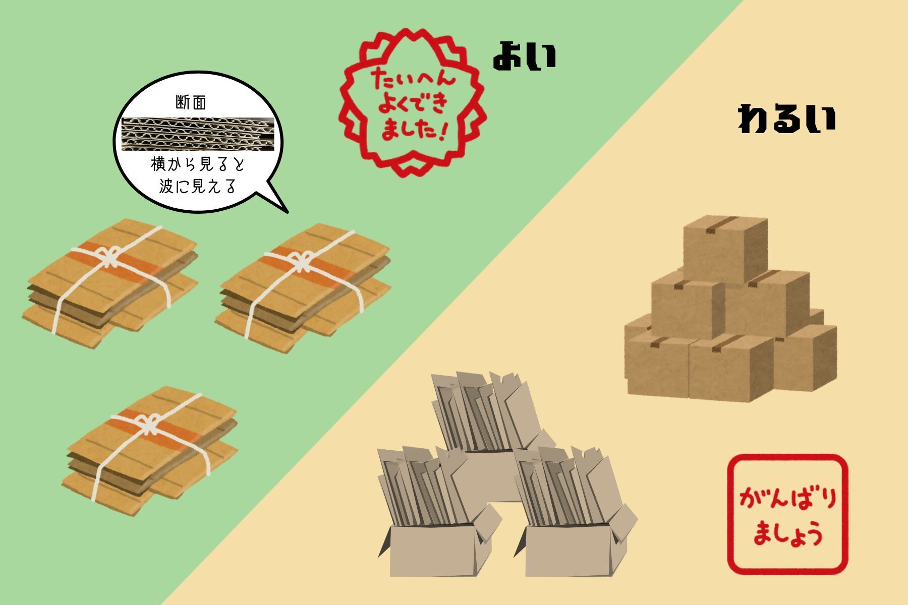 ダンボールや紙袋を容器として使用しないでください。ダンボール箱の中にダンボールを入れることもしないでください。容器と使用すると、資源としてリサイクルできなくなるため、折りたたんで十文字にひもで縛ってください。