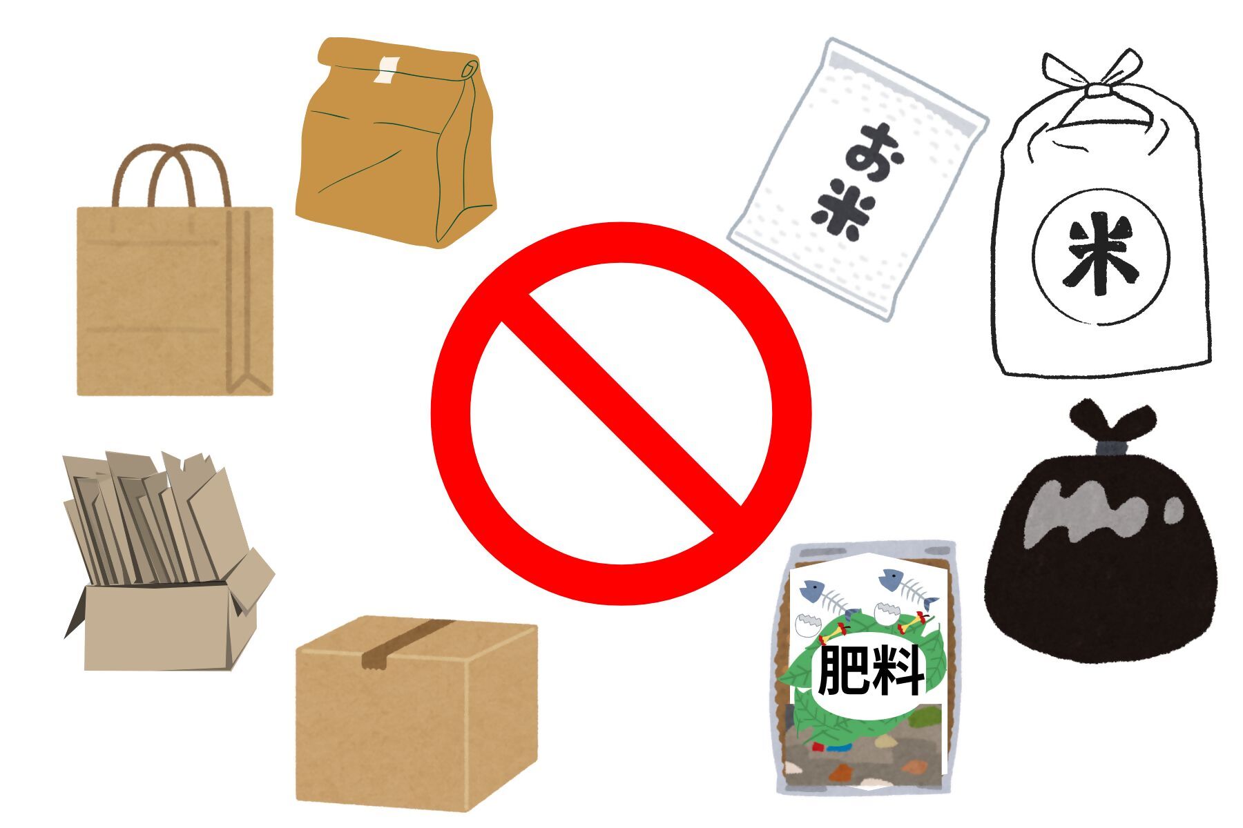 黒い袋や米袋などの不透明な袋は利用しないでください。不透明な袋は袋を開けて、ごみの分別が正しくされているかを確認しますので、ごみ収集の遅延につながります。また、米袋も大切な資源です。紙質の米袋は資源ごみの日(雑誌・雑紙)に、プラスチック質の米袋はプラスチックマークを確認し、マークがあれば容器包装プラスチックの日、マークがなければその他プラスチックの日に捨ててください。