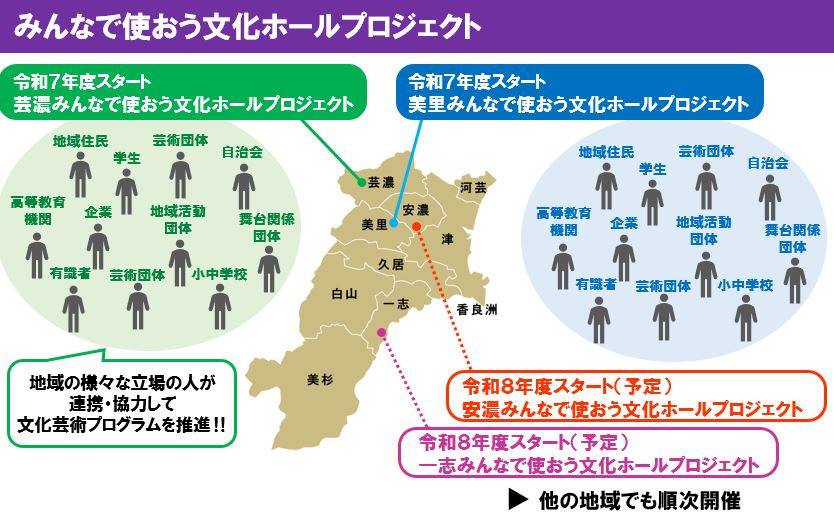 地域に活力と魅力を生み出す文化芸術活動活性化プロジェクト事業の推進体制を「みんなで使おう文化ホールプロジェクト」としました。施設改修・市民芸術活動プログラム両面から文化ホールを再生することで、地域の方々が“わがまちの文化ホール”としての意識を高め、自主的、自立的に利活用することで、文化ホールを拠点とした文化振興による地方創生につなげていきます。