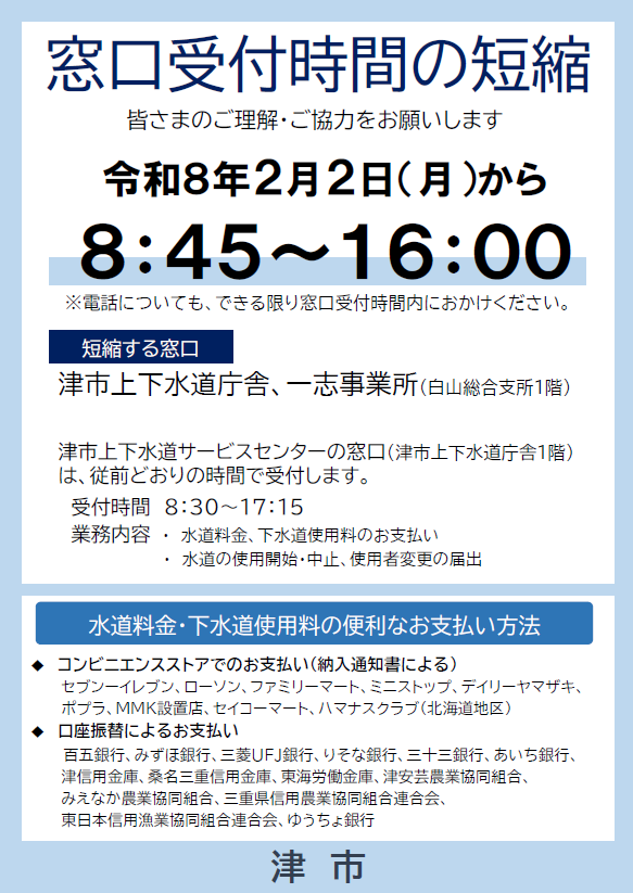 津市では、各種申請のオンライン利用の増加や証明書のコンビニ交付サービスの浸透により、窓口にお越しにならなくても一部手続が可能となる中、職員の働き方改革を推進し、恒常的に発生している時間外勤務の削減、職員一人一人の心身の安定や職務に対する意欲向上及び業務改善を検討する時間を確保することで市民サービスの向上を図るため、窓口受付時間を短縮します。