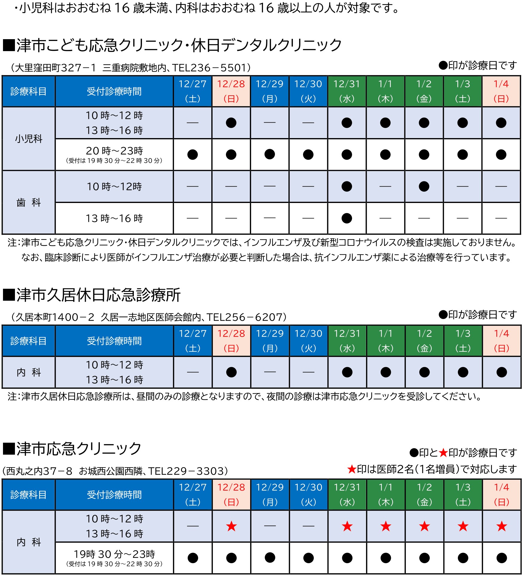 年末年始における「津市こども応急クリニック・休日デンタルクリニック」、「津市久居休日応急診療所」及び「津市応急クリニック」は、下記の「応急診療所の診療日」のとおり診療を行っています。受診を希望される方は受付時間内にご来所ください。
