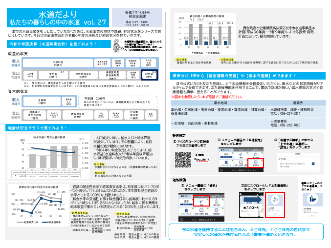 ・令和6年度決算(水道事業会計)を見てみよう! ・経営状況をグラフで見てみよう! ・津市公式LINEから【緊急情報の受信】や【漏水の通報】ができます! |