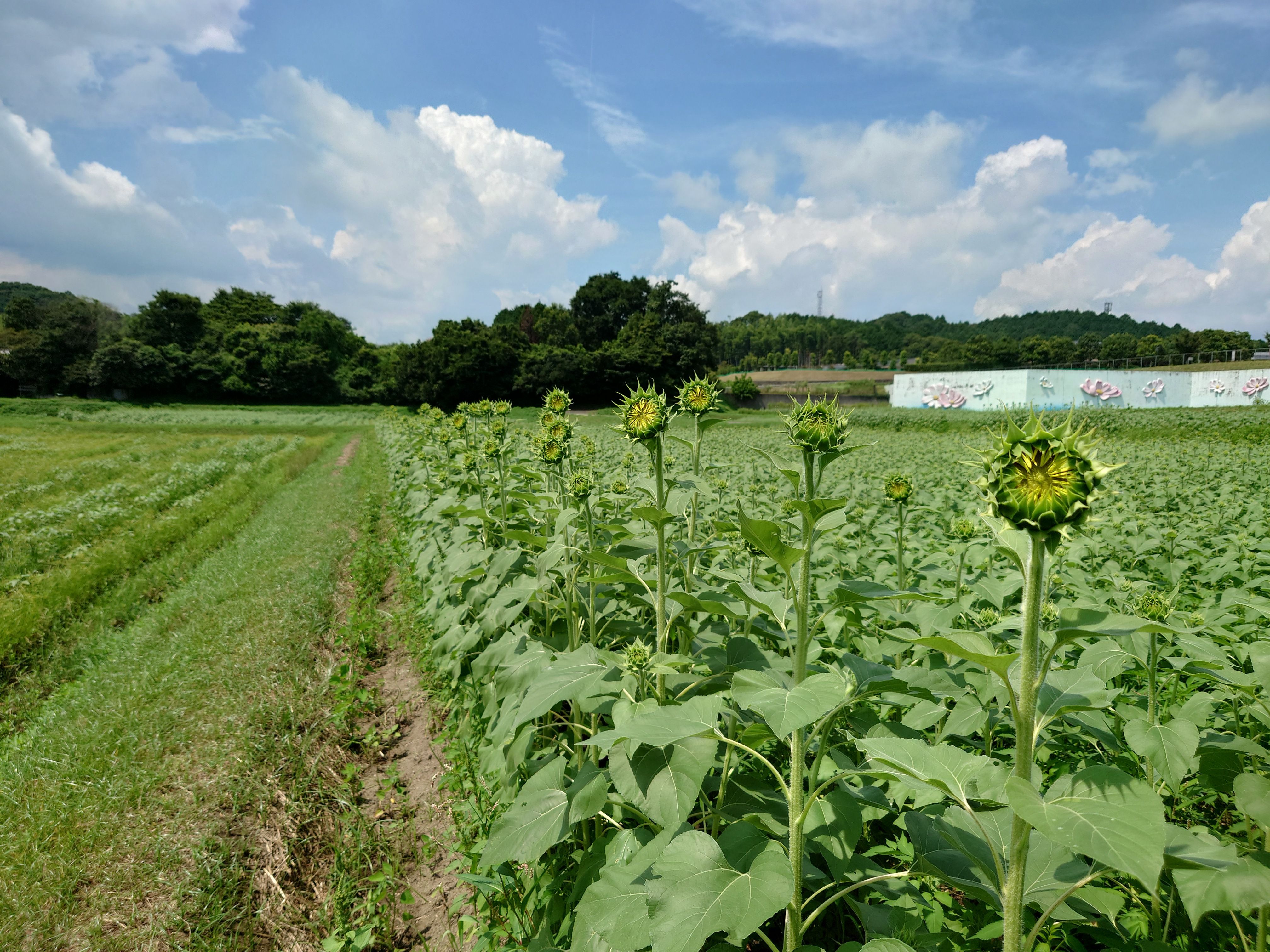 猛暑の中、つぼみを付けたひまわりは、大輪の花を咲かせようとそろって太陽の方を向いていました。
