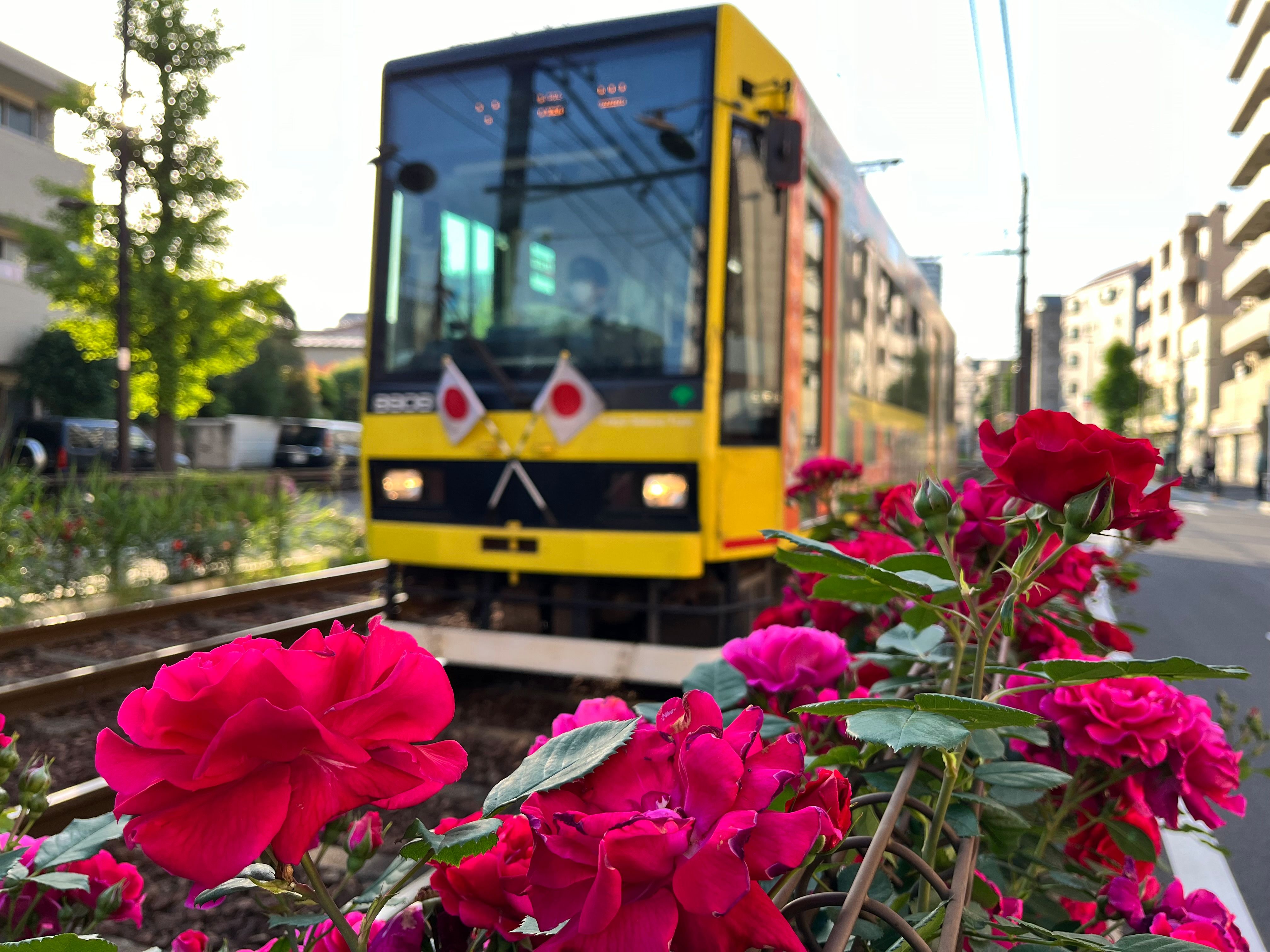 近所を走る「都電荒川線」沿線のバラが見頃を迎えています。