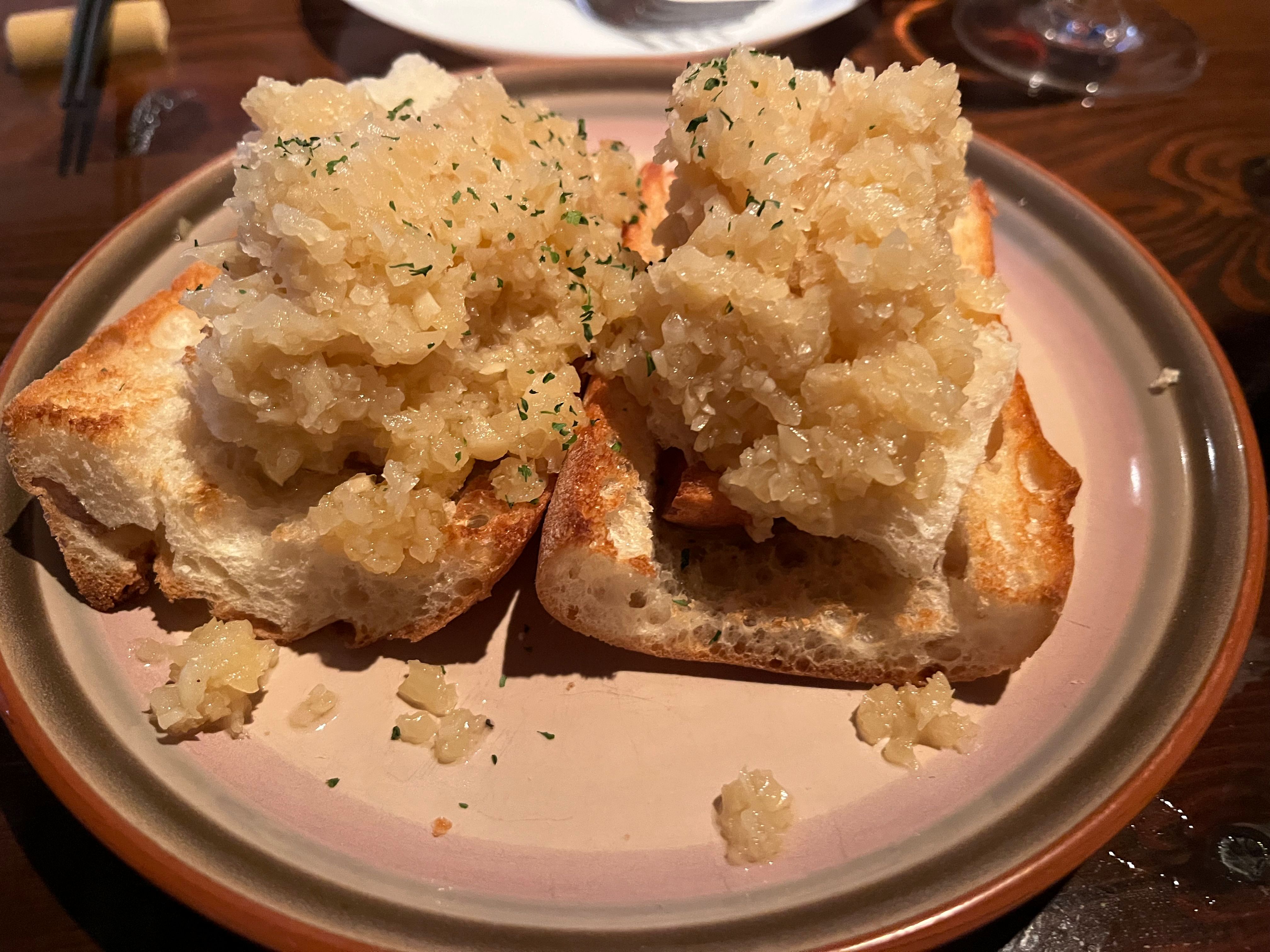 これでもかというぐらいにニンニクてんこ盛りの「ガーリックトースト」。