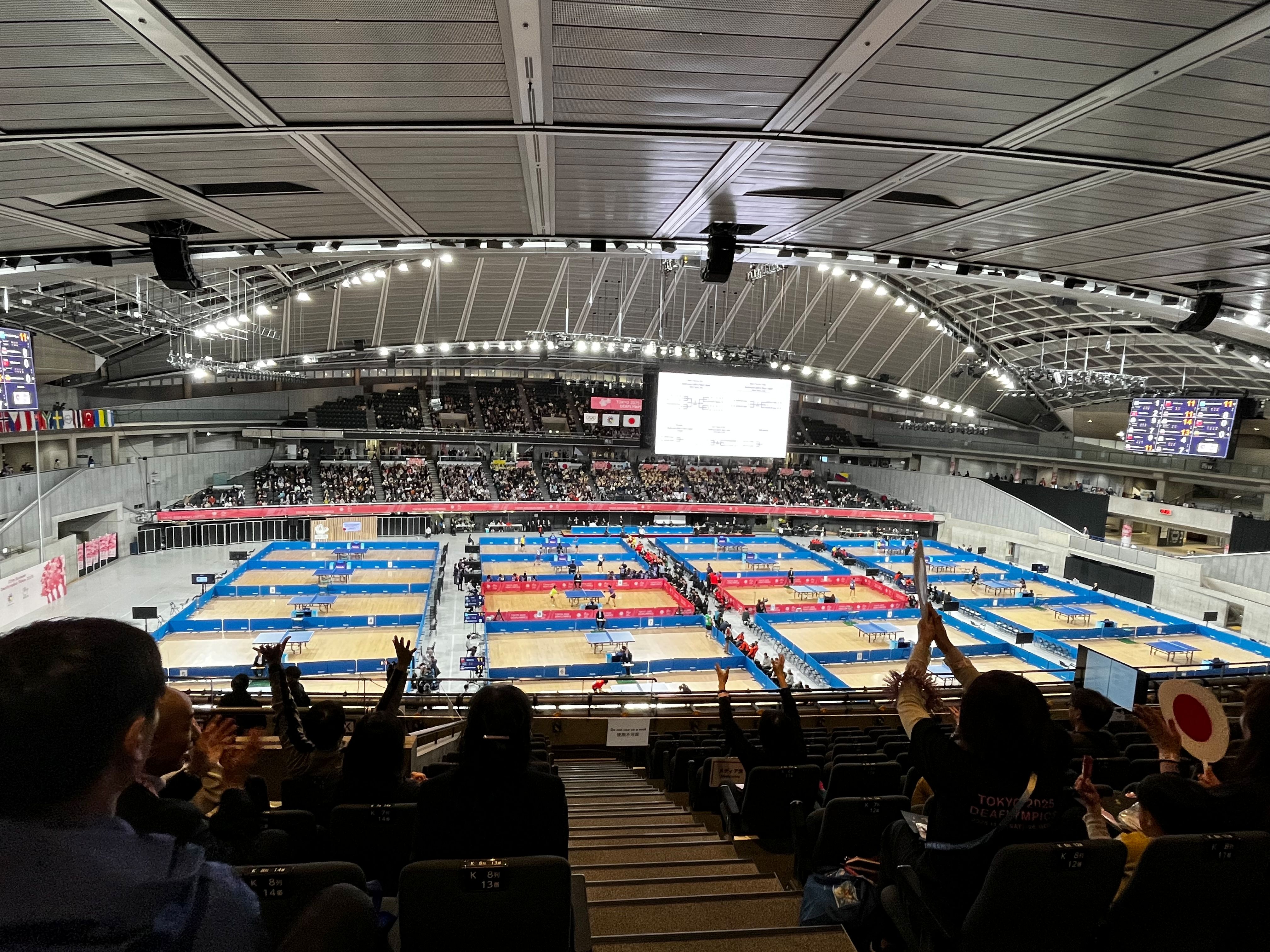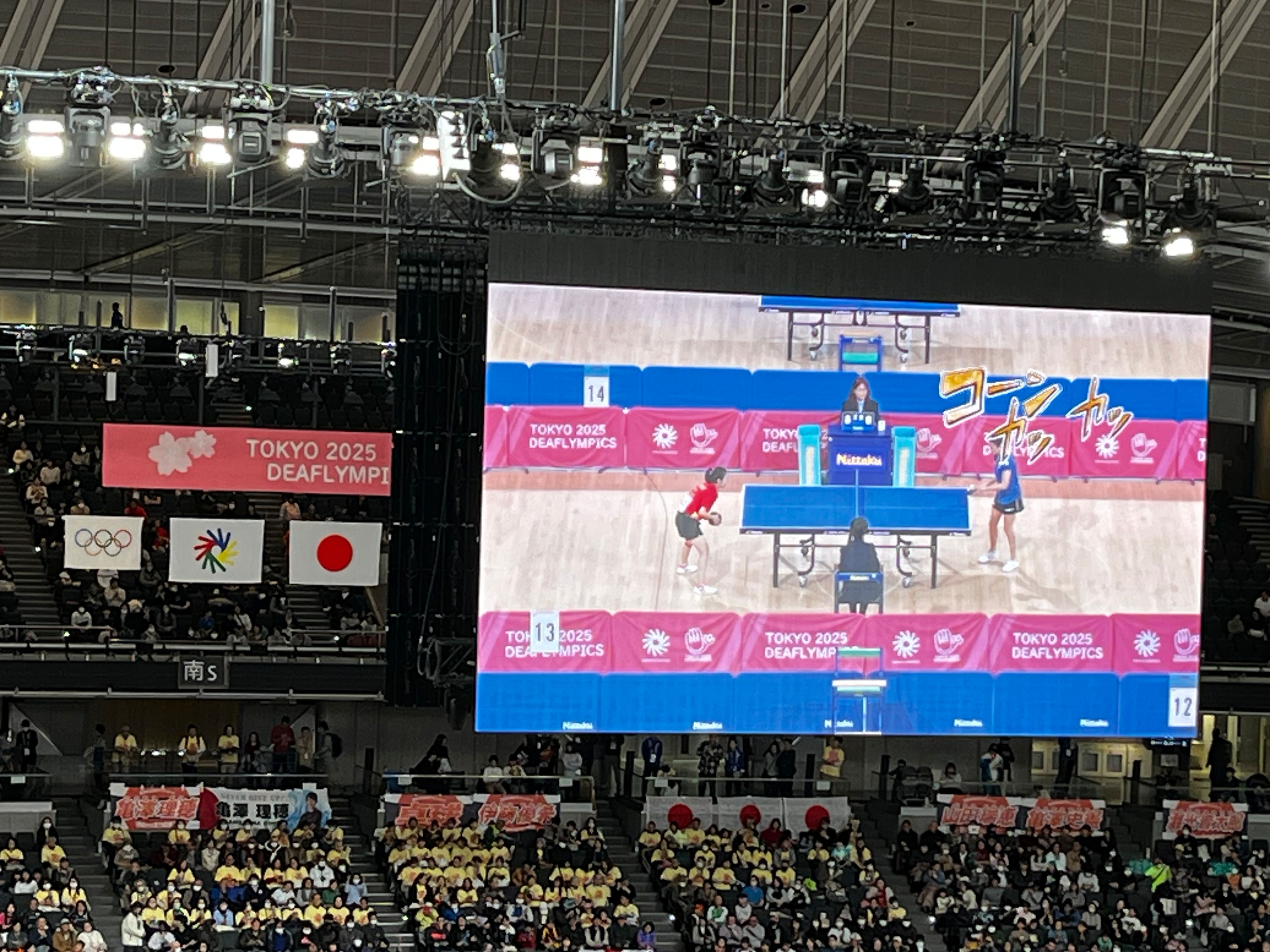 デフリンピックならではの「音が見える」工夫として、ラリー音や歓声、競技の臨場感が表示されるディスプレイが設置され、聴覚に障がいがある方も音を視覚的に楽しめるようになっていました。