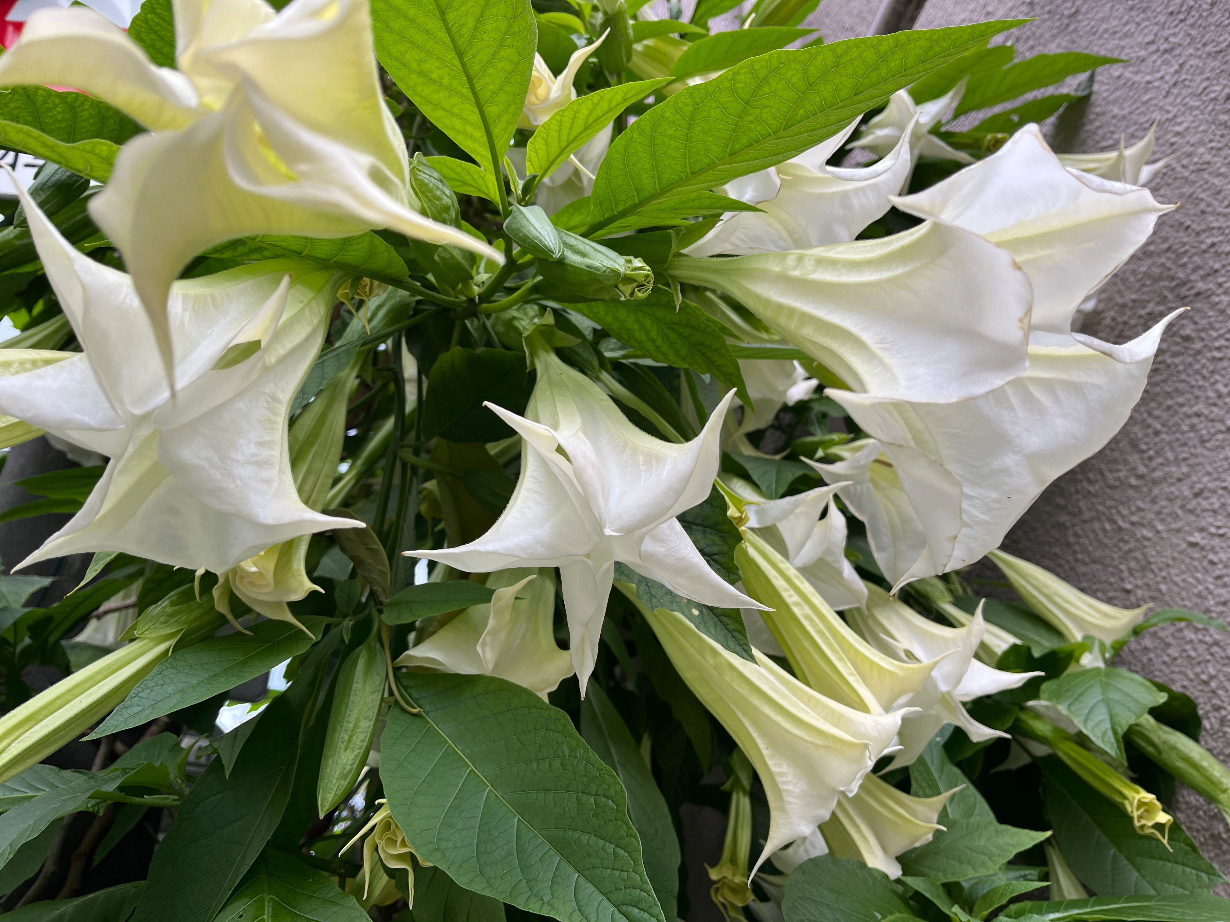 調べてみると、「エンジェルトランペット」などの園芸名がついた和名「キダチチョウセンアサガオ」という常緑低木であることがわかりました。