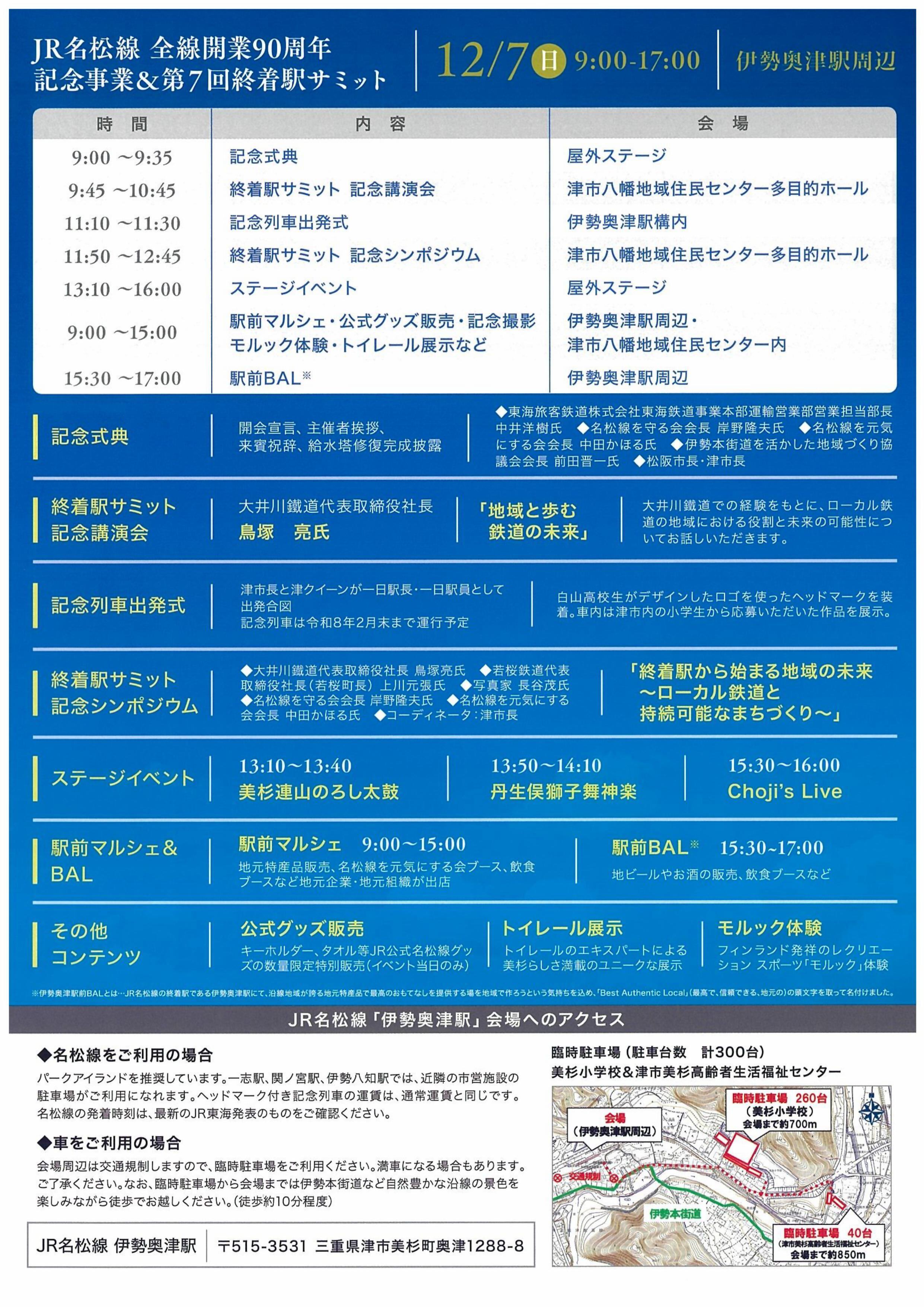 「JR名松線全線開通90周年記念事業」と「第7回終着駅サミット」が今週末12月7日日曜日に名松線の終着駅である伊勢奥津駅周辺で開催されます。