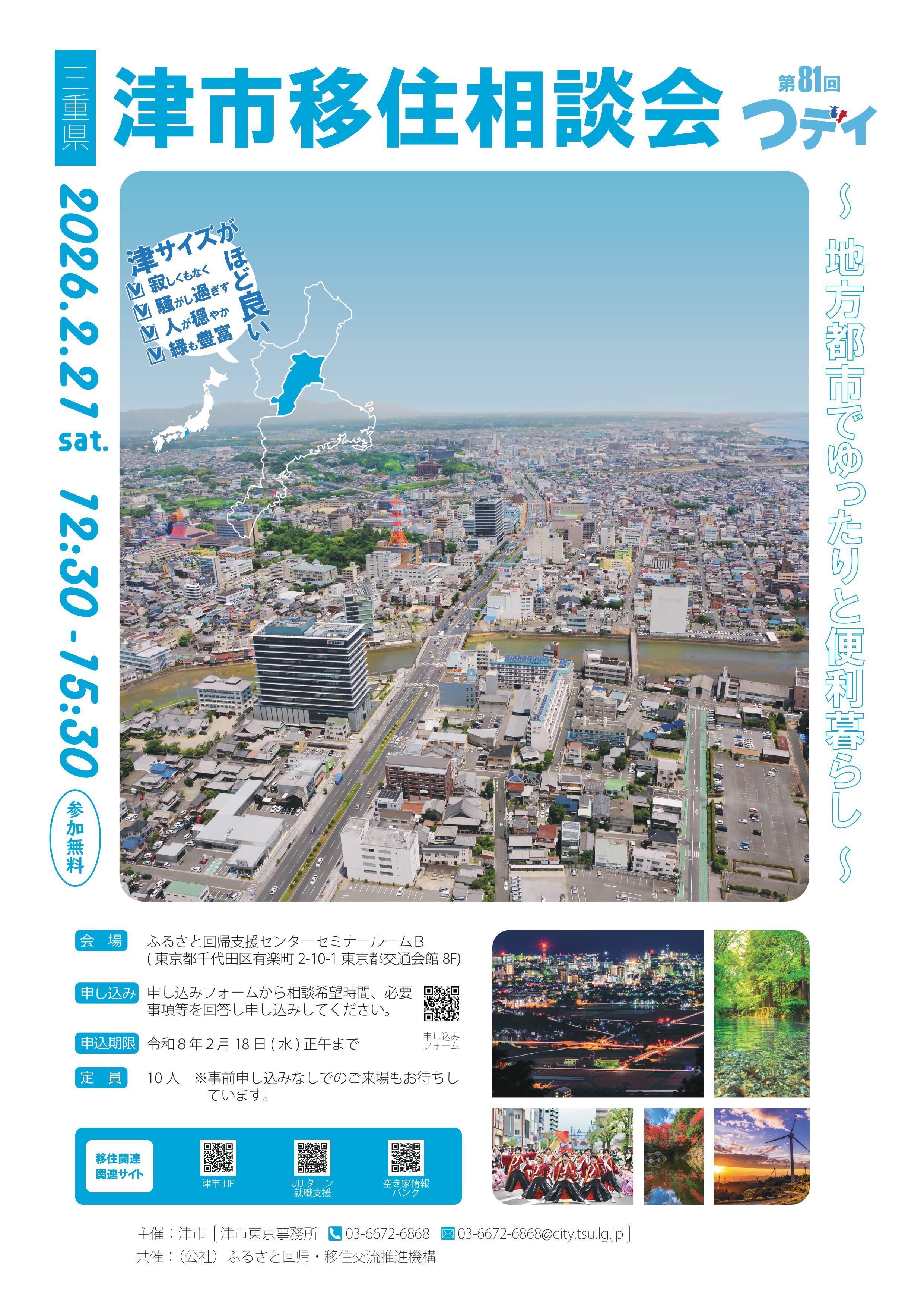 今回は「津市移住相談会~地方都市でゆったり便利暮らし~」と題して、移住をお考えの方、移住に興味がある方に、津市の情報をお伝えさせていただきます。